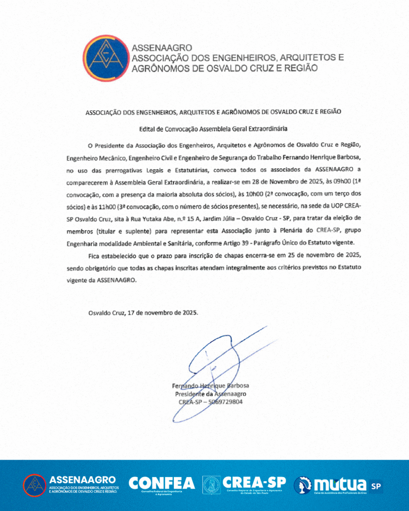 O Presidente da Associação dos Engenheiros, Arquitetos e Agrônomos de Osvaldo Cruz e Região, Engenheiro Mecânico, Engenheiro Civil e Engenheiro de Segurança do Trabalho Fernando Henrique Barbosa, no uso das prerrogativas Legais e Estatutárias, convoca todos os associados da ASSENAAGRO a comparecerem à Assembleia Geral Extraordinária, a realizar-se em 28 de Novembro de 2025, às 09h00 (1ª convocação, com a presença da maioria absoluta dos sócios), às 10h00 (2ª convocação, com um terço dos sócios) e às 11h00 (3ª convocação, com o número de sócios presentes), se necessário, na sede da UOP CREA-SP Osvaldo Cruz, sita à Rua Yutaka Abe, n.º 15 A, Jardim Júlia – Osvaldo Cruz – SP, para tratar da eleição de membros (titular e suplente) para representar esta Associação junto à Plenária do CREA-SP, grupo Engenharia modalidade Ambiental e Sanitária, conforme Artigo 39 – Parágrafo Único do Estatuto vigente.